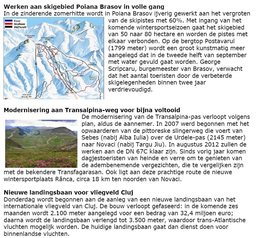 | 12 september 2011 Toeristisch nieuws van DRN: Uitbreiding skigebied Poiana Brasov, Transalpinaweg bijna voltooid en nieuwe landingsbaan vliegveld Cluj. Meer informatie hier. |
